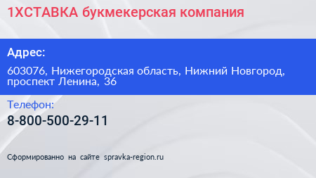 1ХСТАВКА, букмекерская компания по адресу 603076, Нижегородская область, Нижний Новгород, проспект Ленина, 36 в дальнейшем Организация, размещена в следующих категориях: