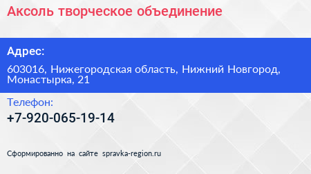 Аксоль, творческое объединение по адресу 603016, Нижегородская область, Нижний Новгород, Монастырка, 21 в дальнейшем Организация, размещена в следующих категориях: