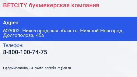 BETCITY, букмекерская компания по адресу 603002, Нижегородская область, Нижний Новгород, Долгополова, 45а в дальнейшем Организация, размещена в следующих категориях:
