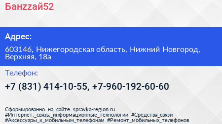 Банzzай52 по адресу 603146, Нижегородская область, Нижний Новгород, Верхняя, 18а в дальнейшем Организация, размещена в следующих категориях: