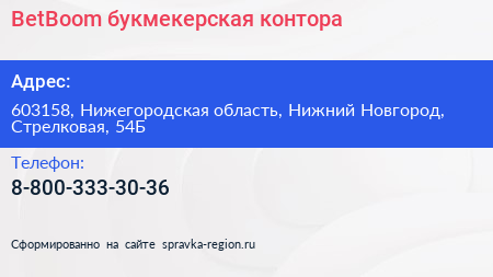 BetBoom, букмекерская контора по адресу 603158, Нижегородская область, Нижний Новгород, Стрелковая, 54Б в дальнейшем Организация, размещена в следующих категориях: