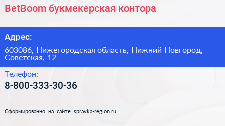BetBoom, букмекерская контора по адресу 603086, Нижегородская область, Нижний Новгород, Советская, 12 в дальнейшем Организация, размещена в следующих категориях: