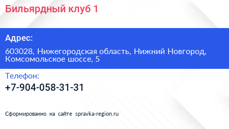 Бильярдный клуб №1 по адресу 603028, Нижегородская область, Нижний Новгород, Комсомольское шоссе, 5 в дальнейшем Организация, размещена в следующих категориях: