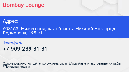 Bombay Lounge по адресу 603163, Нижегородская область, Нижний Новгород, Родионова, 195 к1 в дальнейшем Организация, размещена в следующих категориях: