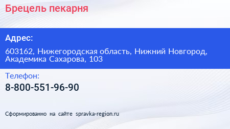 Брецель, пекарня по адресу 603162, Нижегородская область, Нижний Новгород, Академика Сахарова, 103 в дальнейшем Организация, размещена в следующих категориях: