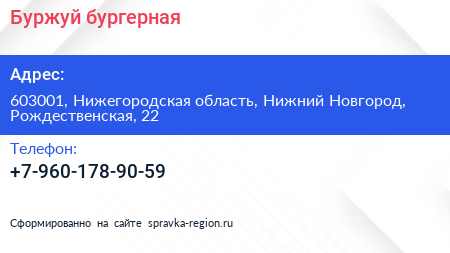 Буржуй, бургерная по адресу 603001, Нижегородская область, Нижний Новгород, Рождественская, 22 в дальнейшем Организация, размещена в следующих категориях: