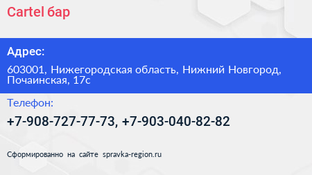 Cartel, бар по адресу 603001, Нижегородская область, Нижний Новгород, Почаинская, 17с в дальнейшем Организация, размещена в следующих категориях:
