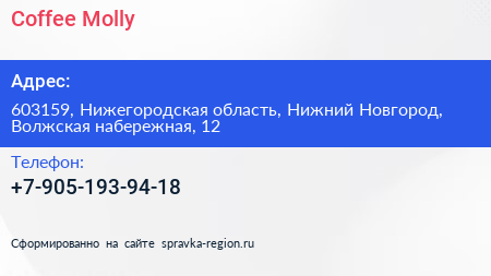 Coffee Molly по адресу 603159, Нижегородская область, Нижний Новгород, Волжская набережная, 12 в дальнейшем Организация, размещена в следующих категориях: