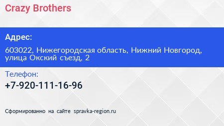 Crazy Brothers по адресу 603022, Нижегородская область, Нижний Новгород, улица Окский съезд, 2 в дальнейшем Организация, размещена в следующих категориях: