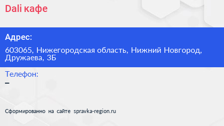 Dali, кафе по адресу 603065, Нижегородская область, Нижний Новгород, Дружаева, 3Б в дальнейшем Организация, размещена в следующих категориях:
