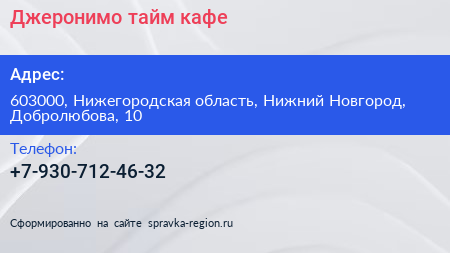 Джеронимо, тайм-кафе по адресу 603000, Нижегородская область, Нижний Новгород, Добролюбова, 10 в дальнейшем Организация, размещена в следующих категориях: