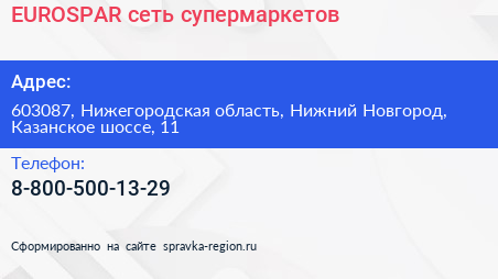 EUROSPAR, сеть супермаркетов по адресу 603087, Нижегородская область, Нижний Новгород, Казанское шоссе, 11 в дальнейшем Организация, размещена в следующих категориях: