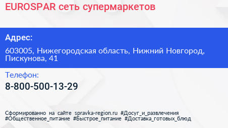 EUROSPAR, сеть супермаркетов по адресу 603005, Нижегородская область, Нижний Новгород, Пискунова, 41 в дальнейшем Организация, размещена в следующих категориях: