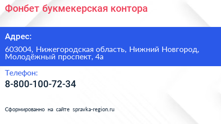 Фонбет, букмекерская контора по адресу 603004, Нижегородская область, Нижний Новгород, Молодёжный проспект, 4а в дальнейшем Организация, размещена в следующих категориях: