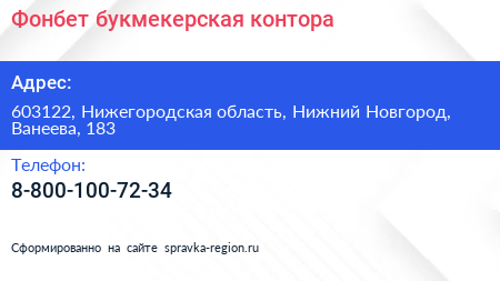 Фонбет, букмекерская контора по адресу 603122, Нижегородская область, Нижний Новгород, Ванеева, 183 в дальнейшем Организация, размещена в следующих категориях: