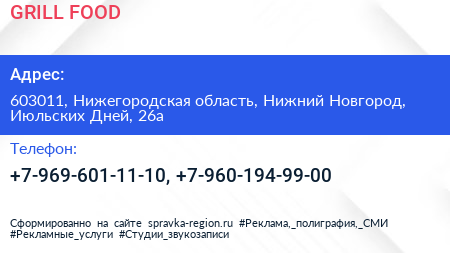 GRILL FOOD по адресу 603011, Нижегородская область, Нижний Новгород, Июльских Дней, 26а в дальнейшем Организация, размещена в следующих категориях: