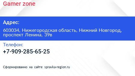Gamer zone по адресу 603034, Нижегородская область, Нижний Новгород, проспект Ленина, 39в в дальнейшем Организация, размещена в следующих категориях: