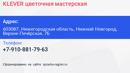 KLEVER, цветочная мастерская по адресу 603087, Нижегородская область, Нижний Новгород, Верхне-Печёрская, 7Б в дальнейшем Организация, размещена в следующих категориях: