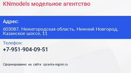 KNmodels, модельное агентство по адресу 603087, Нижегородская область, Нижний Новгород, Казанское шоссе, 11 в дальнейшем Организация, размещена в следующих категориях: