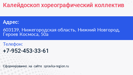 Калейдоскоп, хореографический коллектив по адресу 603139, Нижегородская область, Нижний Новгород, Героев Космоса, 50а в дальнейшем Организация, размещена в следующих категориях: