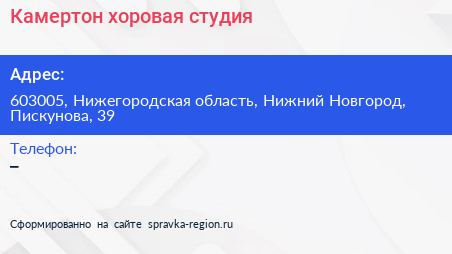 Камертон, хоровая студия по адресу 603005, Нижегородская область, Нижний Новгород, Пискунова, 39 в дальнейшем Организация, размещена в следующих категориях: