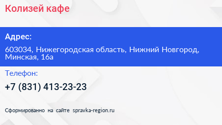 Колизей, кафе по адресу 603034, Нижегородская область, Нижний Новгород, Минская, 16а в дальнейшем Организация, размещена в следующих категориях: