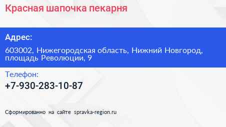 Красная шапочка, пекарня по адресу 603002, Нижегородская область, Нижний Новгород, площадь Революции, 9 в дальнейшем Организация, размещена в следующих категориях: