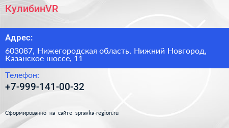 КулибинVR по адресу 603087, Нижегородская область, Нижний Новгород, Казанское шоссе, 11 в дальнейшем Организация, размещена в следующих категориях: