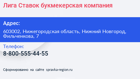 Лига Ставок, букмекерская компания по адресу 603002, Нижегородская область, Нижний Новгород, Фильченкова, 7 в дальнейшем Организация, размещена в следующих категориях: