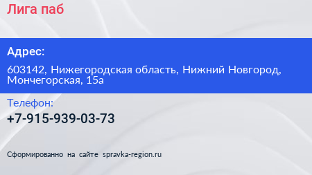 Лига, паб по адресу 603142, Нижегородская область, Нижний Новгород, Мончегорская, 15а в дальнейшем Организация, размещена в следующих категориях: