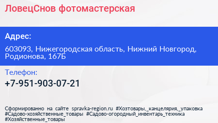 ЛовецСнов, фотомастерская по адресу 603093, Нижегородская область, Нижний Новгород, Родионова, 167Б в дальнейшем Организация, размещена в следующих категориях: