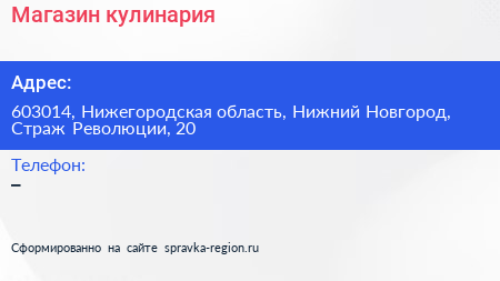 Магазин-кулинария по адресу 603014, Нижегородская область, Нижний Новгород, Страж Революции, 20 в дальнейшем Организация, размещена в следующих категориях: