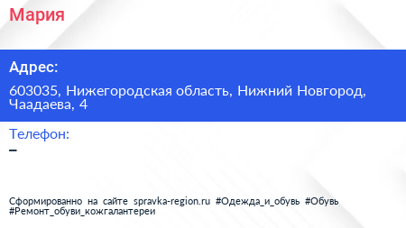 Мария по адресу 603035, Нижегородская область, Нижний Новгород, Чаадаева, 4 в дальнейшем Организация, размещена в следующих категориях: