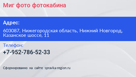 Миг фото, фотокабина по адресу 603087, Нижегородская область, Нижний Новгород, Казанское шоссе, 11 в дальнейшем Организация, размещена в следующих категориях: