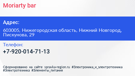 Moriarty bar по адресу 603005, Нижегородская область, Нижний Новгород, Пискунова, 29 в дальнейшем Организация, размещена в следующих категориях: