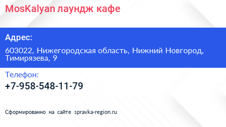 MosKalyan, лаундж-кафе по адресу 603022, Нижегородская область, Нижний Новгород, Тимирязева, 9 в дальнейшем Организация, размещена в следующих категориях: