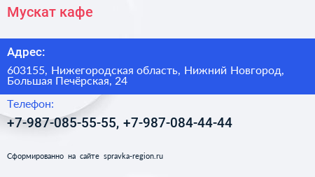 Мускат, кафе по адресу 603155, Нижегородская область, Нижний Новгород, Большая Печёрская, 24 в дальнейшем Организация, размещена в следующих категориях: