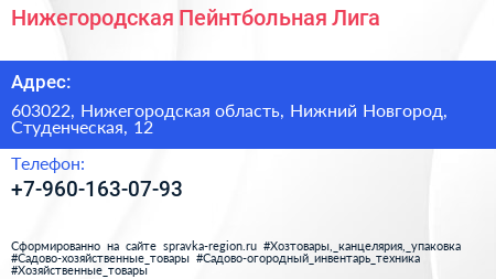 Нижегородская Пейнтбольная Лига по адресу 603022, Нижегородская область, Нижний Новгород, Студенческая, 12 в дальнейшем Организация, размещена в следующих категориях: