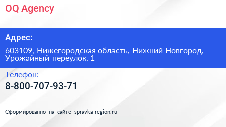 OQ.Agency по адресу 603109, Нижегородская область, Нижний Новгород, Урожайный переулок, 1 в дальнейшем Организация, размещена в следующих категориях:
