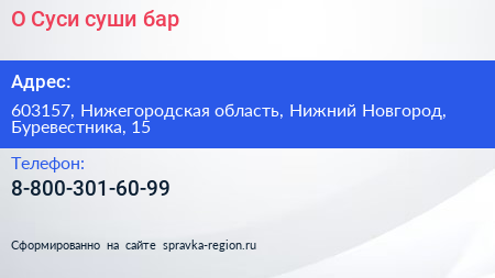 О`Суси, суши-бар по адресу 603157, Нижегородская область, Нижний Новгород, Буревестника, 15 в дальнейшем Организация, размещена в следующих категориях: