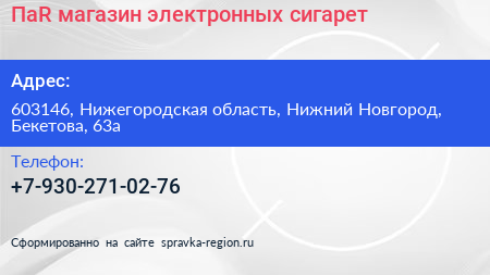 ПаR, магазин электронных сигарет по адресу 603146, Нижегородская область, Нижний Новгород, Бекетова, 63а в дальнейшем Организация, размещена в следующих категориях:
