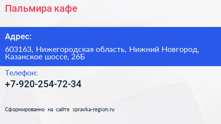 Пальмира, кафе по адресу 603163, Нижегородская область, Нижний Новгород, Казанское шоссе, 26Б в дальнейшем Организация, размещена в следующих категориях: