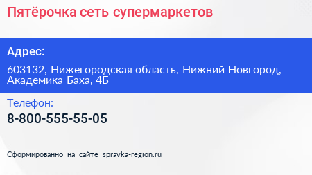 Пятёрочка, сеть супермаркетов по адресу 603132, Нижегородская область, Нижний Новгород, Академика Баха, 4Б в дальнейшем Организация, размещена в следующих категориях: