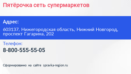 Пятёрочка, сеть супермаркетов по адресу 603137, Нижегородская область, Нижний Новгород, проспект Гагарина, 202 в дальнейшем Организация, размещена в следующих категориях: