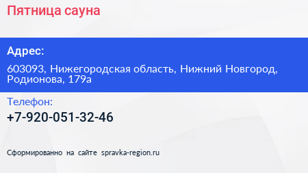 Пятница, сауна по адресу 603093, Нижегородская область, Нижний Новгород, Родионова, 179а в дальнейшем Организация, размещена в следующих категориях: