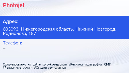 Photojet по адресу 603093, Нижегородская область, Нижний Новгород, Родионова, 187 в дальнейшем Организация, размещена в следующих категориях: