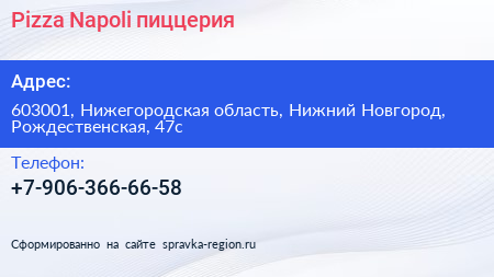 Pizza Napoli, пиццерия по адресу 603001, Нижегородская область, Нижний Новгород, Рождественская, 47с в дальнейшем Организация, размещена в следующих категориях: