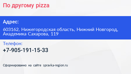По-другому pizza по адресу 603162, Нижегородская область, Нижний Новгород, Академика Сахарова, 119 в дальнейшем Организация, размещена в следующих категориях: