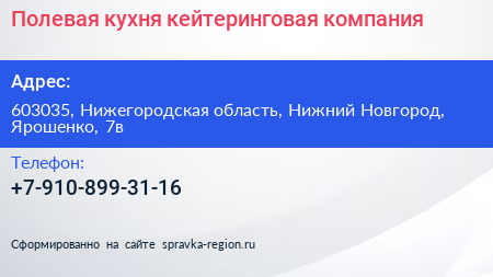 Полевая кухня, кейтеринговая компания по адресу 603035, Нижегородская область, Нижний Новгород, Ярошенко, 7в в дальнейшем Организация, размещена в следующих категориях: