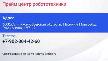 Прайм, центр робототехники по адресу 603163, Нижегородская область, Нижний Новгород, Родионова, 197 к2 в дальнейшем Организация, размещена в следующих категориях: